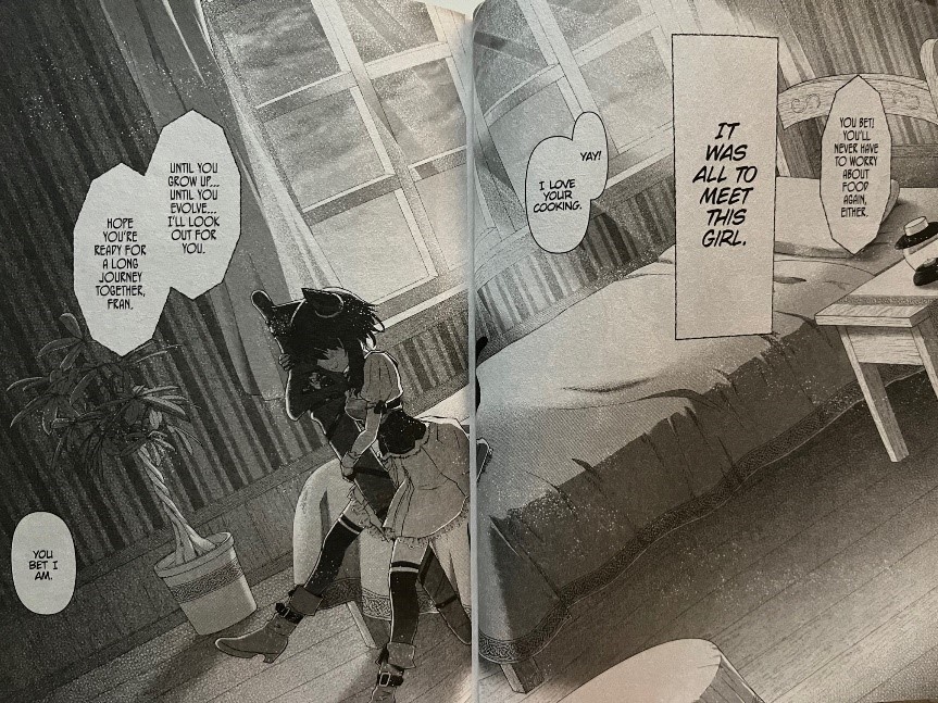 Of course, that wouldn’t happen instantly, so they had some time to kill and some levelling up to do. Because of Fran’s low adventurer rank, the best quests they could take on were herb-gathering ones, which were incredibly boring. On one of these quests, they overheard some swords clinking. Was someone fighting? Fran rushed to help the three adventurers who were surrounded and outnumbered by goblins and hobgoblins. Fran killed them all and then learnt that a goblin stampede was likely.