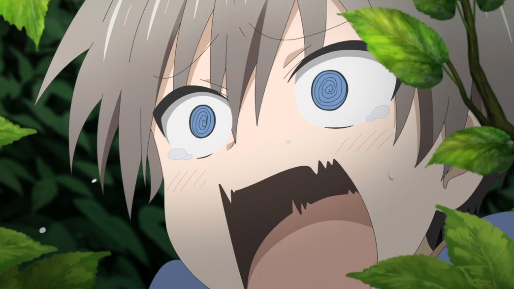 The next morning, Uzaki found Sakuria trying to pet a cat, but it kept attacking him. She showed him how to approach a cat and successfully stroked it. However, a loud noise spooked it and it ran away. Sakurai was gutted. Uzaki ran after it and tried to catch it but got stuck in a bush with just her lower half hanging out, her panties revealed. Sakurai was stunned and instinctively smacked her bum with his pad of paper. Uzaki was stunned too! Then, when he tried to pull her out, some people walked by and it looked far worse than it was…